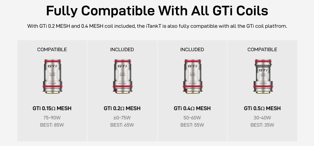 Compatible avec les fameuses résistances GTi en mesh, le iTank T vous assure une restitution des saveurs puissante et une production de vapeur impressionnante